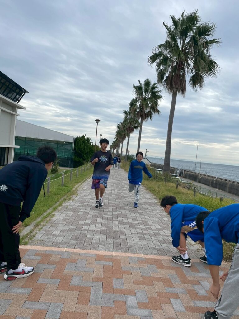 垂水体育館は海が近くて、朝の集合前に少しだけ海辺を歩きました。波の音を聞いて深呼吸をすると、胸のドキドキが少しおさまって、いいスタートが切れた気がします。青い海と空をバックに撮ったチーム写真は、今日の大切な思い出になりました。