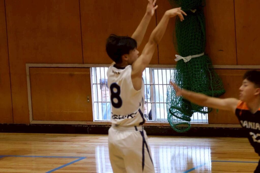 #8小林の3Pで勢いをつけると、#10中村の速攻が決まり一気に2桁差。相手がファウルゲームに切り替えてもフリースローを確実に決め切り、最終的には18点差で勝利を収めた。